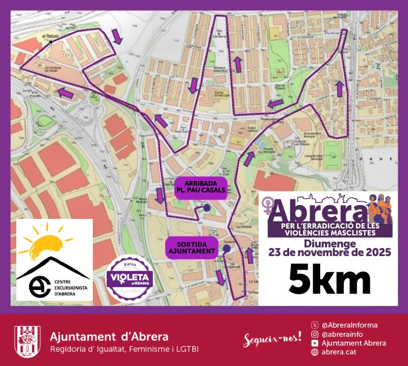 Un any més, conjuntament amb el Centre Excursionista d’Abrera organitzem la ja consolidada Marxa contra les violències masclistes al nostre municipi. L’activitat s’iniciarà a les 10.00 h a la plaça de la Constitució, i finalitzarà cap a les 13.00 h a la plaça de Pau Casals. Prèviament a la marxa es llegirà el Manifest en motiu del 25 de novembre, dia Internacional per l’erradicació de les violències masclistes.