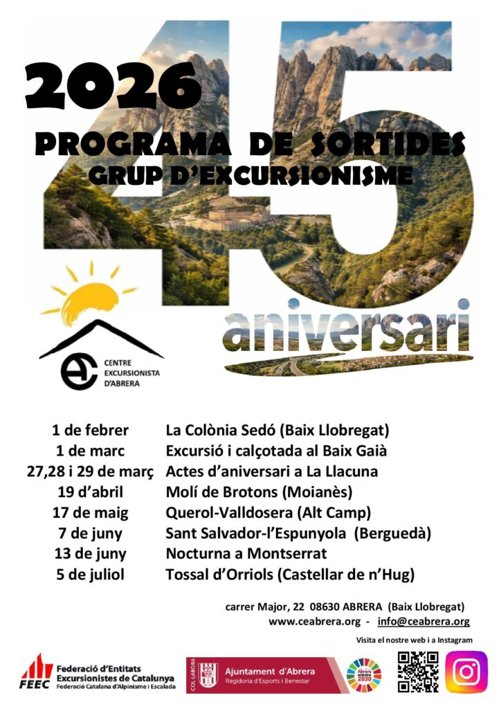Us presentem el calendari de sortides d’excursionisme fins el mes d’agost. Les excursions proposades són d’un nivell esportiu baix-mig destinades a persones acostumades a caminar i a un cert esforç físic necessari per afrontar desnivells i terrenys inestables. Cada proposta té en aquest web una pàgina reservada on s’expliquen les principals característiques.Trobarem matinals que ens permetran tornar a casa a dinar, de tot el dia on hi ha un important desplaçament amb vehicles o l’excursió és més llarga. També tenim de cap de setmana per celebrar el 45è aniversari del Centre. Les sortides són gratuïtes i com tota activitat que organitza el Centre Excursionista d’Abrera tothom ha d’estar federat, sigui amb la llicència anual o amb una temporal que se ha de so-licitar al menys amb una setmana d’antelació.