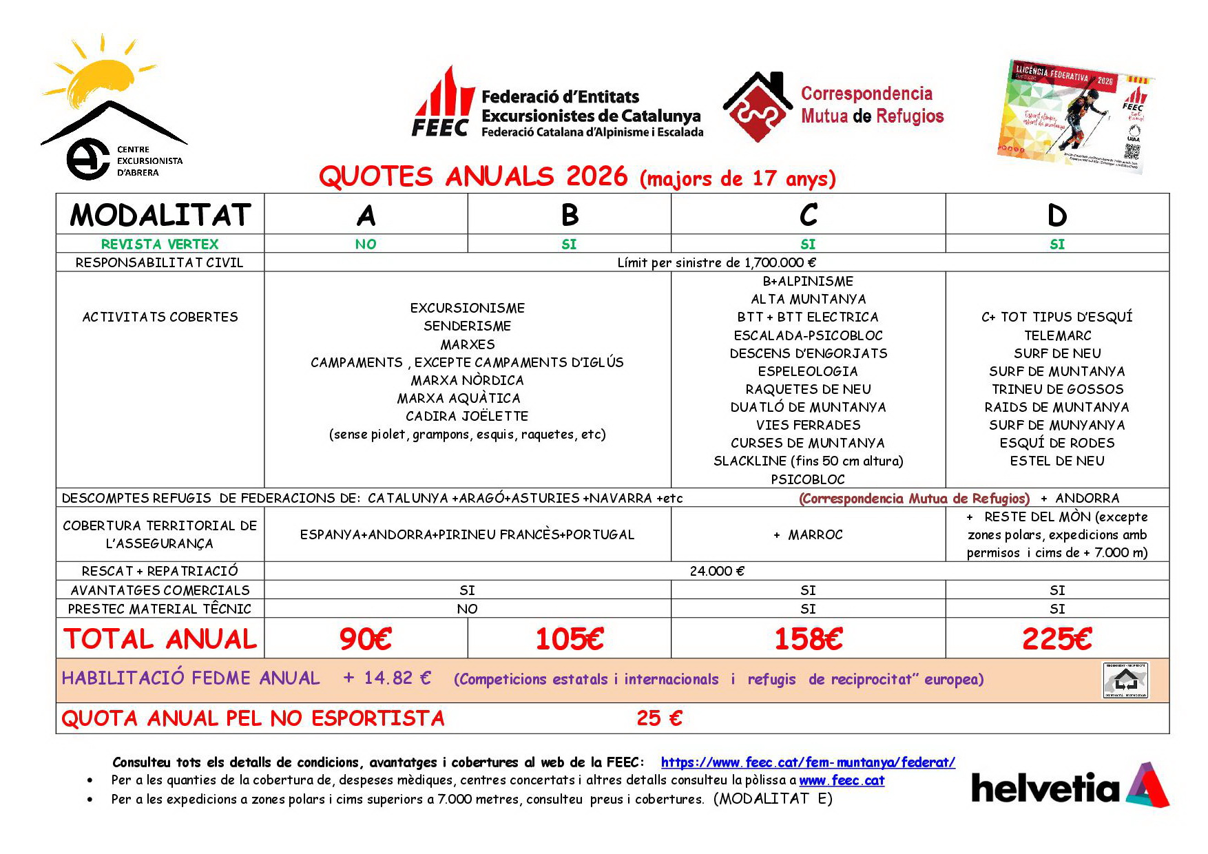 Podeu informar-vos amb detall de les cobertures i avantatges comercials al web de la Federació d’Entitats Excursionistes de Catalunya.